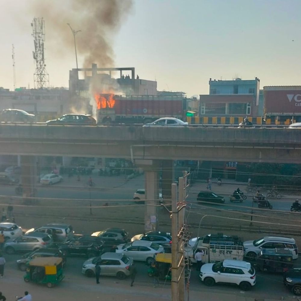 जीरकपुर में चलते ट्रक में लगी आग:ड्राइवर ने कूदकर बचाई अपनी जान, शार्ट सर्किट कारण, फ्लाईओवर पर लगा जाम