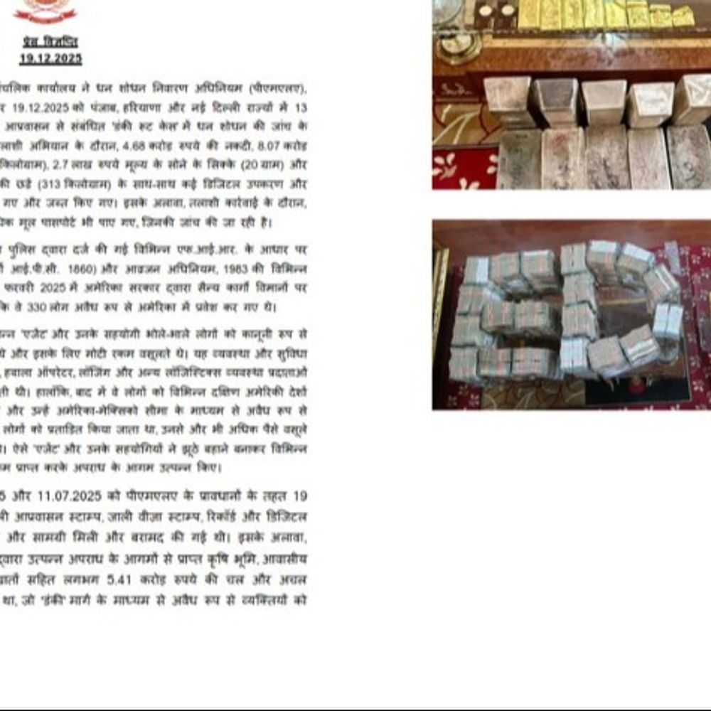 ईडी जालंधर ने पीएमएलए, 2002 के तहत ‘डंकी रूट केस’ में अवैध आप्रवासन और धन शोधन की जांच को लेकर 18 और 19 दिसंबर को बड़ी कार्रवाई की। इस दौरान पंजाब, हरियाणा और नई दिल्ली में कुल 13 स्थानों पर तलाशी अभियान चलाया गया, जिसमें करोड़ों रुपए की नकदी, सोना-चांदी की भारी मात्रा, कई डिजिटल उपकरण और आपत्तिजनक दस्तावेज जब्त किए गए। इसके साथ ही, 50 से अधिक मूल पासपोर्ट भी बरामद हुए हैं, जिनकी जांच जारी है। प्रवर्तन निदेशालय के जालंधर जोनल ऑफिस द्वारा की गई इस कार्रवाई को ‘डंकी रूट’ के जरिए अवैध रूप से लोगों को विदेश भेजने वाले नेटवर्क के खिलाफ बड़ी सफलता माना जा रहा है। ईडी ने यह कार्रवाई धन शोधन निवारण अधिनियम यानी PMLA, 2002 के प्रावधानों के तहत की, जो अवैध आप्रवासन से जुड़े वित्तीय लेन-देन और मनी लॉन्ड्रिंग की जांच से संबंधित है। करोड़ रूपए के नकदी बरामद ED के तलाशी अभियान के दौरान अधिकारियों को कुल 4.68 करोड़ रुपए की नकदी बरामद हुई। इसके अलावा करीब 8.07 करोड़ रुपए की 5.9 किलोग्राम सोने की छड़ें, 2.7 लाख रुपए के 20 ग्राम सोने के सिक्के और लगभग 6.42 करोड़ रुपए के 313 किलोग्राम चांदी की छड़ें भी जब्त की गईं। अधिकारियों के अनुसार, यह संपत्ति अवैध आप्रवासन से जुड़े एजेंटों और नेटवर्क के जरिए एकत्र की गई आय से संबंधित हो सकती है। तलाशी के दौरान कई डिजिटल उपकरण मिले ईडी को तलाशी के दौरान कई डिजिटल उपकरण भी मिले हैं, जिनमें मोबाइल फोन, लैपटॉप, हार्ड डिस्क और अन्य इलेक्ट्रॉनिक डिवाइस शामिल हैं। इन उपकरणों में मौजूद डेटा की फॉरेंसिक जांच की जा रही है, ताकि अवैध लेन-देन, हवाला नेटवर्क और विदेशी संपर्कों के सबूत जुटाए जा सकें। इसके साथ ही विभिन्न अपराध-संकेतक रिकॉर्ड और दस्तावेज भी बरामद हुए हैं, जो जांच में अहम भूमिका निभा सकते हैं। सबसे चौंकाने वाली बात यह रही कि विभिन्न परिसरों से तीसरे पक्ष के 50 से अधिक मूल पासपोर्ट भी मिले हैं। आशंका जताई जा रही है कि इन पासपोर्टों का इस्तेमाल अवैध रूप से लोगों को विदेश भेजने या फर्जी दस्तावेजों के जरिए यात्रा कराने में किया गया हो सकता है। ईडी इन पासपोर्टों की वैधता, उनके मालिकों और नेटवर्क से जुड़े लोगों की भूमिका की गहन जांच कर रही है।