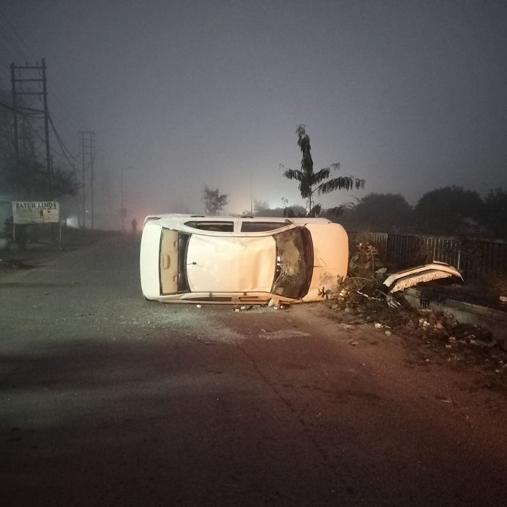 लुधियानामें धुंध से सड़क हादसा, चार घायल:दिल्ली से लौट रही कार दोराहा के पास डिवाइडर से टकराकर पलटी