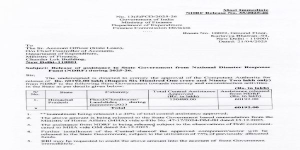 उन्होंने कहा कि भारतीय जनता पार्टी आपदा पीड़ितों के साथ मजबूती से खड़ी है और केंद्र सरकार का यह सहयोग हिमाचल प्रदेश के लिए संबल बनेगा।