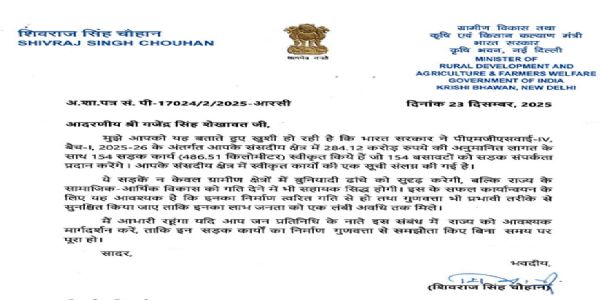 केंद्रीय मंत्री शिवराज सिंह चौहान के पत्र को साझा करते हुए शेखावत ने बताया कि नए साल से ठीक पहले यह जोधपुर क्षेत्र के गांवों के लिए बड़ी खुशखबरी है। इन 486.51 किलाेमीटर सड़कों से 154 क्षेत्रों के रहवासियों को सीधा सड़क संपर्क मिलेगा, जिससे हमारे ग्रामीण बहनों-भाइयों को शिक्षा, स्वास्थ्य, कृषि और रोजगार से जुड़े अनेक लाभ होंगे। उन्होंने कहा कि सड़कें उद्यमिता व आत्मनिर्भरता की भावना को मजबूत करती हैं।